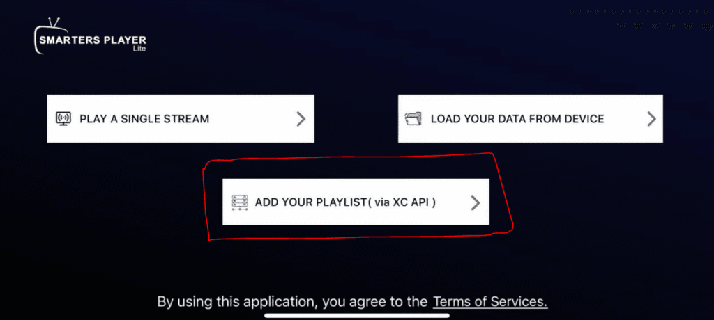 Open the app and add a playlist via “XC API,” which stands for Xtream Codes API: